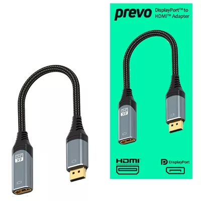 Prevo DPM-HDMIF-ADA Display Converter Adapter, DisplayPort (M) to HDMI (F), 0.2m, Black & Silver, DisplayPort 1.4 & HDMI 2.0, Supports up to 4K@60Hz, Braided Cable, Retail Box Packaging